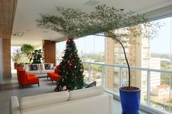 Os vasos foram feitos sob medida em madeira cumaru e aço galvanizado, com gavetas coletores de água, com rodízios para facilitar a manutenção.