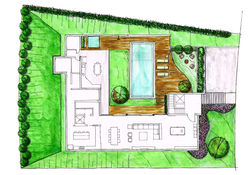 A principal área que integra a arquitetura com o paisagismo é o espaço da piscina, por isso sugerimos uma jabuticabeira de grande porte, com um banco de madeira para ampliar o espaço e integra-lo à área gourmet.